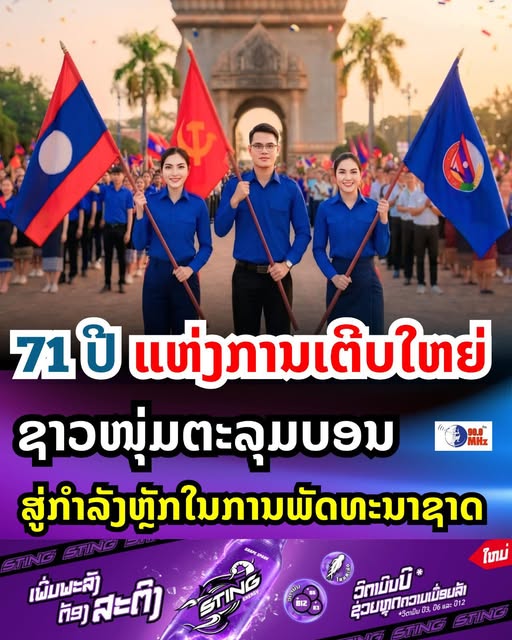 – ຕົ້ນກໍາເນີດຂອງ ຄະນະຊາວໜຸ່ມປະຊາຊົນປະຕິວັດລາວ ໃນປັດຈຸບັນ. ໃນໂອກາດຄົບຮອບ 71 ປີນີ້, ພວກເຮົາຮ່ວມກັນສະເຫຼີມສະຫຼອງດ້ວຍຄວາມພາກພູມໃຈ ໃນຖານະທີ່ຊາວໜຸ່ມຄື “ແຂນຂວາ” ຂອງພັກ ແລະ ເປັນ “ກະດູກສັນຫຼັງ” ທີ່ແຂງແກ່ນຂອງປະເທດຊາດ.